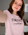 Be the talk of the town in our Fun Fact | Short Sleeve T-Shirt - made with a clever combination of cotton and cheek, it's your excuse to let the world know that, yes, you do not care. Flaunt your sassy sarcasm in this comfy, yet thought-provoking tee!